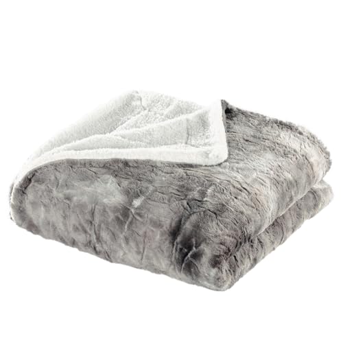 Moderne und flauschige Felldecke Unterseite: uni weiße Decke in Lammfelloptik Oberseite: Graue Kunstfelldecke