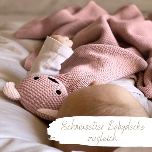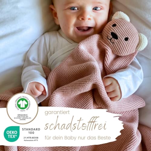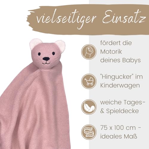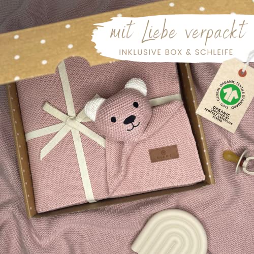 DIKOS Original Babydecke SCHMUSE-Bär (Altrosa) – Premium 2-in-1 Neugeborenen Kuscheldecke & Schmusetuch – aus weicher gestrickter Bio-Baumwolle (GOTS/Oeko-TEX) – Geschenk zur Geburt für Baby Mädchen