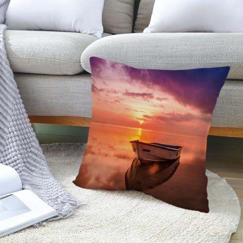 Epinki 40x40cm Zierkissenhülle, Dekokissen 1 Pcs mit Sonnenuntergang und Boot Motiv Bequem Leinen für Zuhause Wohnzimmer Schlafzimmer Sofa Dekor, Leinen, Lila Orange