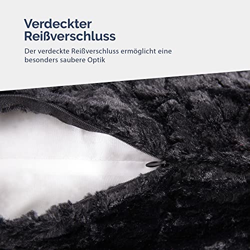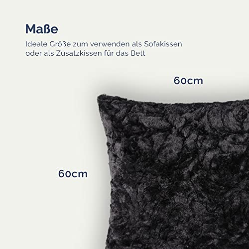 LIEFERUMFANG – Ein Kissenbezug ( Schwarz ) inkl. Füllkissen in Größe 60x60cm mit einem Rosenähnlichen Flauschmuster auf Vorder- und Abseite, bei 30° in der Maschine waschbar
