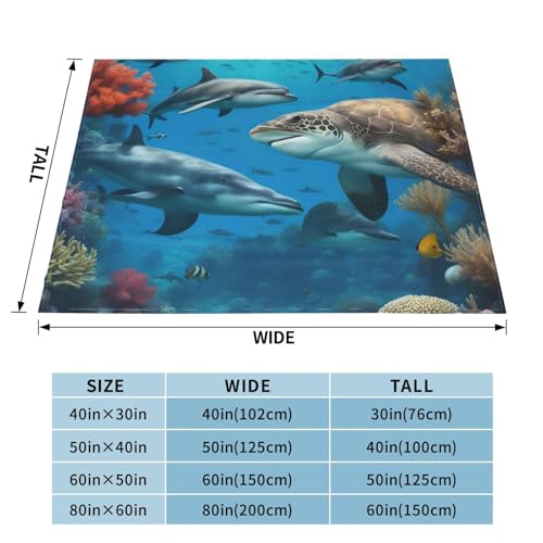 Mehrere Größenoptionen: Erhältlich in vier vielseitigen Größen (101,6 x 76,2 cm, 127 x 101,6 cm, 152,4 x 127 cm, 203,2 x 152,4 cm). Diese weiche Decke mit Delfinen, Meeresschildkröte, Hai, Oktopus, Korallenriffdruck ist für verschiedene Bedürfnisse nach Maß, egal ob Sie es brauchen. Ein kleiner Überwurf für die Couch oder eine große Decke für Ihr Bett.
