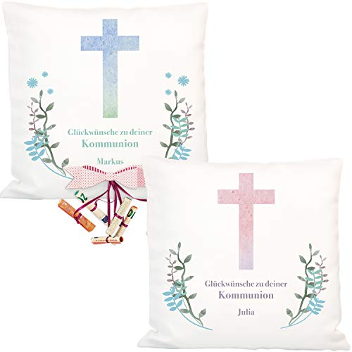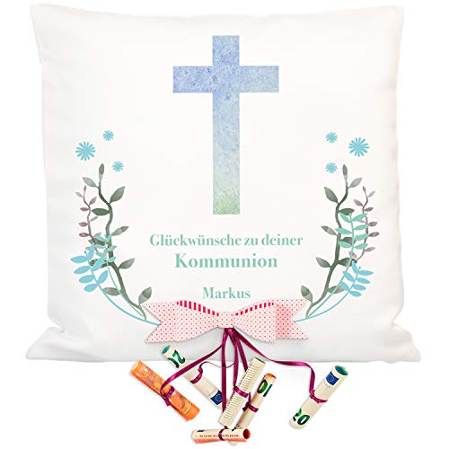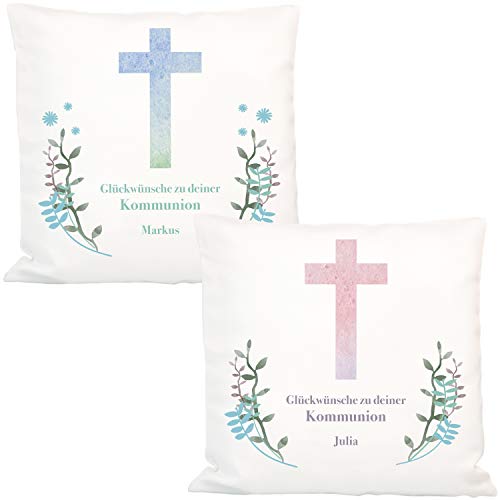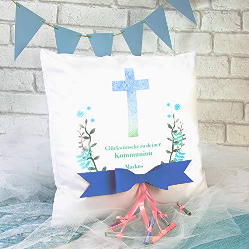 ✅ KREATIV UND PRAKTISCH: Das Zierkissen ist unter Einsatz von einem klassischen Kreuz Motiv und Deinen persönlichen Glückwünschen verziert. Das ganze wird von einem hübschen Kranz umrahmt.