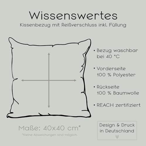 KISSENFAKTEN: Größe 40 x 40cm, in 5 brillianten Farben erhältlich, Vorderseite mit Abdruck (100% Polyester), Abseite farbig mit hochwertiger strukturierter Oberfläche, Maschinenwaschbar bis 30°C, Design und Abdruck in Deutschland!