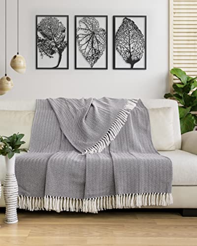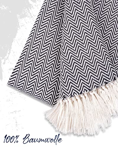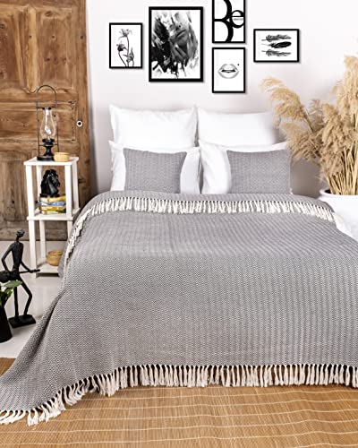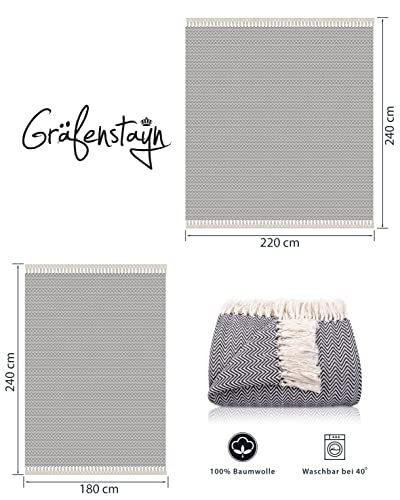 Gräfenstayn Premium Tagesdecke mit Fransen – 100% Baumwolle – 150 x 200 cm – Fischgrätenmuster Sommerdecke – Baumwolldecke als Bett-Überwurf, Couch-Überwurf, Sofa-Decke (Anthrazit)