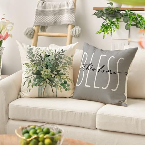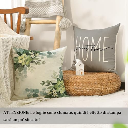 Habodd Kissenbezug 45×45 cm 4er Set Outdoor Dekokissen Sofakissen Grün Eukalyptus Blätter Grau Home Bless Moderne Leinen Kissenbezüge Kissenhülle Deko Kissen für Sofa Bett Garten Frühling Sommer