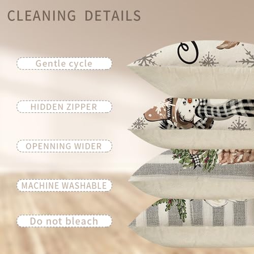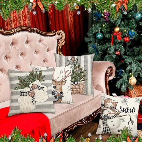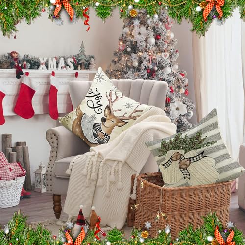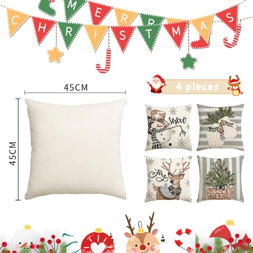 HIQE-FL Leinen Dekokissen 45x45cm, 4 Stück Kissenbezug Weihnachten, Dekorative Kissenhülle Mit Rehntier-Motiv