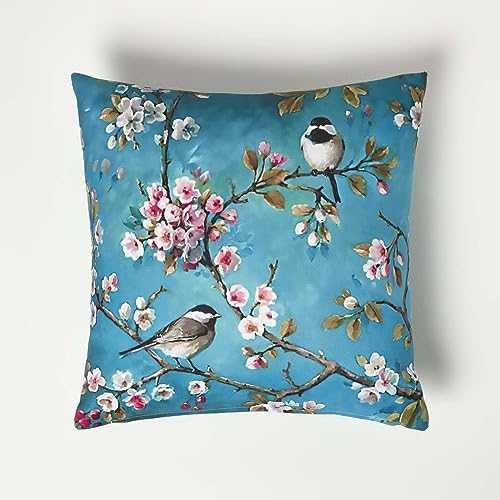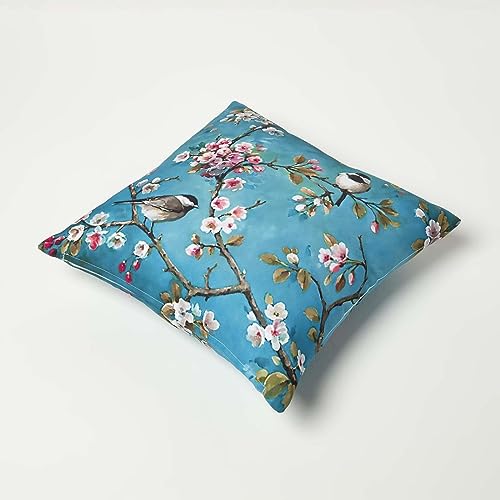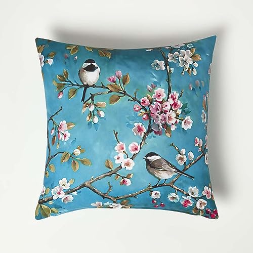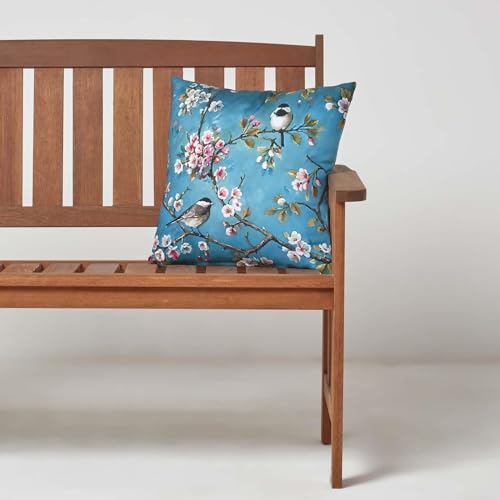 Das 45 x 45 cm große himmelblaue Gartenkissen ‚Floral Birds’ zeigt einen Print mit auf Blütenzweigen sitzenden heimischen Vögeln in brillanten Farben und ist beidseitig bedruckt – ideal, um dekorative Akzente für Naturliebhaber zu setzen.
