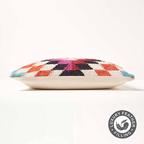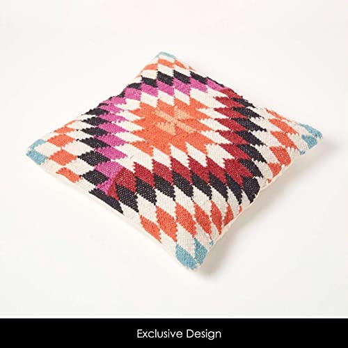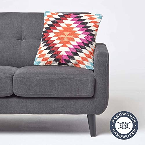 Exklusives handgefertigtes Kelim-Kissen mit geometrischem Muster und hochwertiger Federkissen-Füllung. Design: Manila. Größe: 45 x 45 cm. Farbe: Rot-Pink-Schwarz-Orange-Betrunken-Weiß.