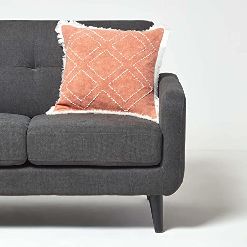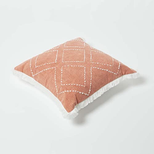 Dekoratives Baumwoll-Kissen in einem erdigen Orange-Ton mit modernem, gesticktem Rautenmuster auf der Vorderseite und verspielten Fransen. Größe ca.: 45 x 45 cm. Farbe: Terracotta-Orange.