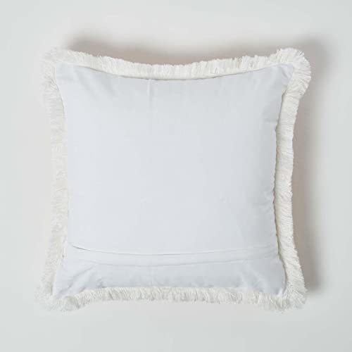 Das 45 x 45 cm große Fransen-Kissen mit geometrischem Stickmuster in attraktiver Leinen-Optik ist ideal für erdverbundene Dekorationen mit Boho-Touch und integriert sich abgerundet in nahezu jedes Interieur. Die einfarbig weiße Abseite ermöglicht bei Bedarf ein schnelles Umstyling und einen in Gänze anderen Look. Die großzügige Füllung sorgt für eine ansprechende Optik und Komfort. Schmücken Sie Sofa, Sessel oder Bett mit dem trendigen Zierkissen und verleihen Sie Ihren Räumen neues Flair.