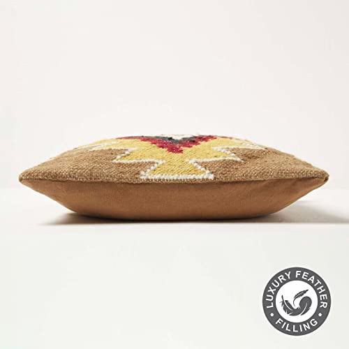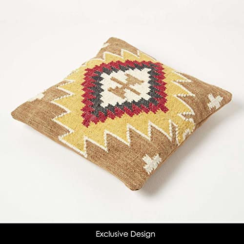 Exklusives handgefertigtes Kelim-Kissen mit geometrischem Muster und hochwertiger Federkissen-Füllung. Design: Jaipur. Größe: 45 x 45 cm. Farbe: Braun-Gelb-Rot-Schwarz-Weiß.
