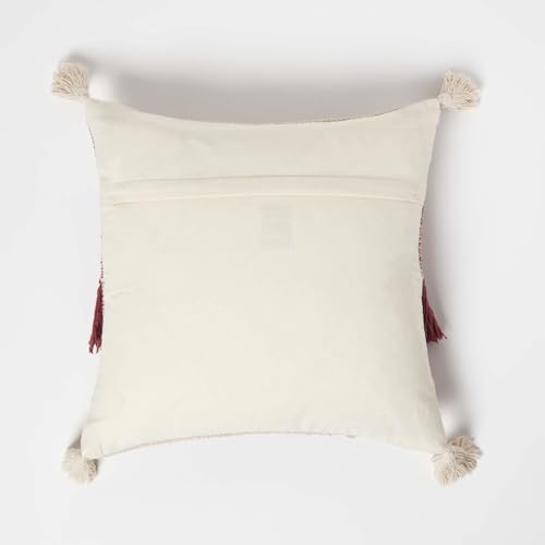 Das rot-weiße gewebte Streifenmuster setzt dekorative Akzente in jedem All. Die verspielten Quasten und Fransen sehen nach einen charmanten Boho-Schleier. Die Kissen-Abseite ist einfarbig cremeweiß gehalten.