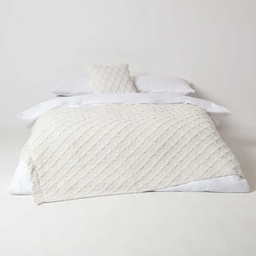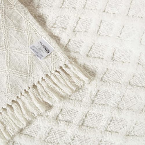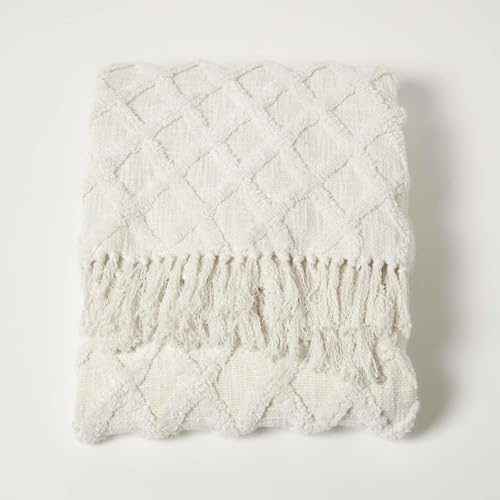 Homescapes Weiße Baumwolldecke 150×200 cm, Getuftete Decke geometrisch Gemustert mit Fransen, Überwurfdecke Boho Style