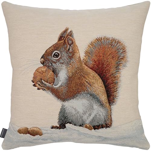 Hossner Heimtex Eichhörnchen im Schnee auf einem wunderschönen Gobelinkissen in griffiger Qualität welches ein echter Blickfang auf Bett, Couch oder Lounge ist