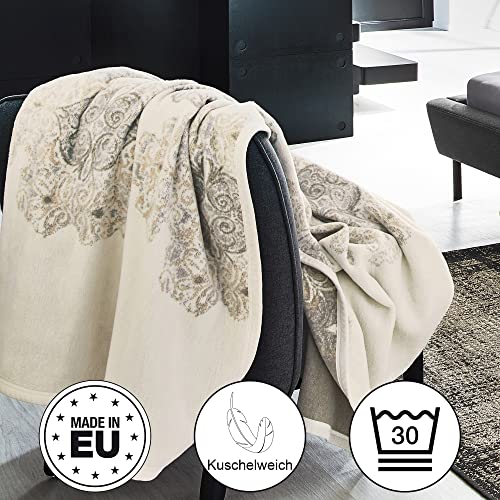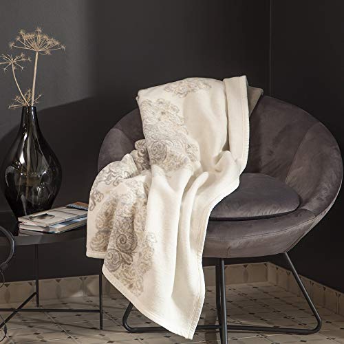 Ibena Bagheria Kuscheldecke 150×200 cm – Decke mit Ornamenten wollweiß grau, Pflegeleichte und kuschelweiche Baumwollmischung