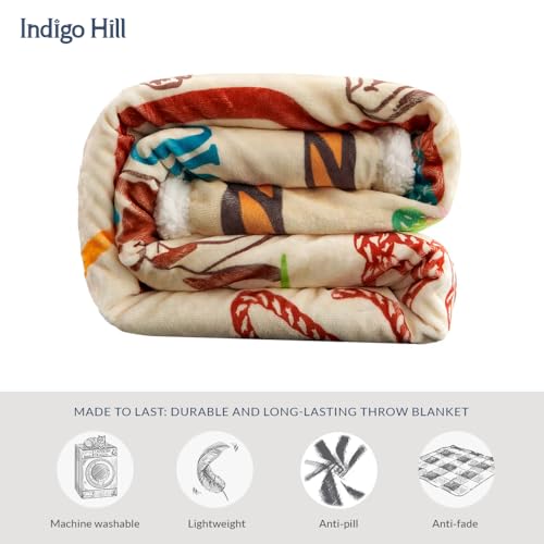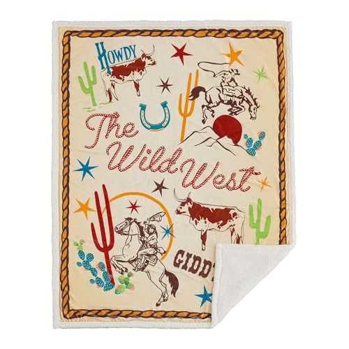 Westliche Überwurfdecke: Diese warme Sherpa-Decke verfügt über westliche Motive von wütenden Cowboys, Wüstenpflanzen und Texas Longhorns in leuchtenden Primärfarben. Mit den Worten „Giddy Up“ und „Wild West“ in Cowboy-inspirierter Art verkörpert sie die Essenz des Ranchlebens durch eine verspielte Linse.