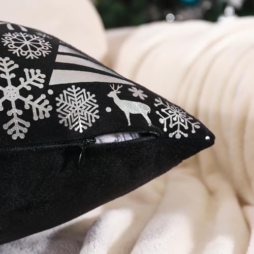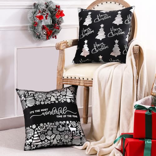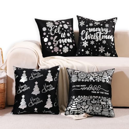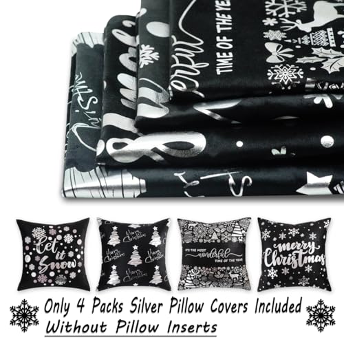 Silberne und schwarze Weihnachts-Kissenbezüge ohne Kisseneinsätze: Set mit 4 silbernen und schwarzen Weihnachtsdekorationen, Kissenbezüge ohne Kisseneinsätze, jeder misst ca. 40,6 x 40,6 cm. Da es von Hand geschnitten und genäht ist, erlauben Sie bitte 1,3 cm Größenabweichung. Leichte Größenfehler haben keinen Einfluss auf den normalen Gebrauch.