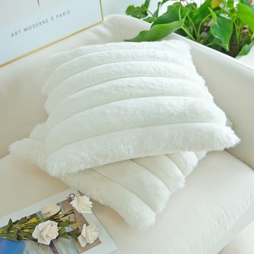 JOJUSIS 2 Stück Kunstfell-Plüsch-Kissenbezüge, Dekokissen Zierkissen, Couchkissen, weich, flauschig, breite Streifen, weiß, 45,7 x 45,7 cm