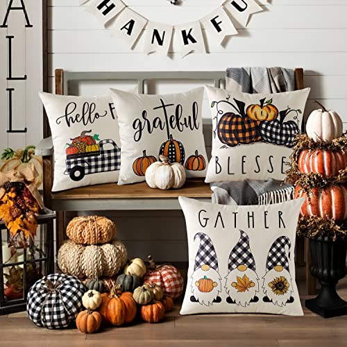 JOTOM Dekorative Kissenbezug Atmungsaktiv Kissenhülle Bunte Dekokissen Sofakissen Bezug Auto Home Bed Büro Cafe Garten Outdoor 45 x 45 cm 4er Set (Herbst Kürbis Schwarz Weiß karo, 45 x 45 cm)
