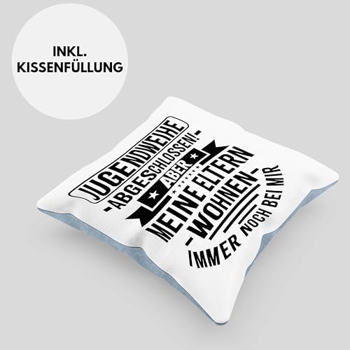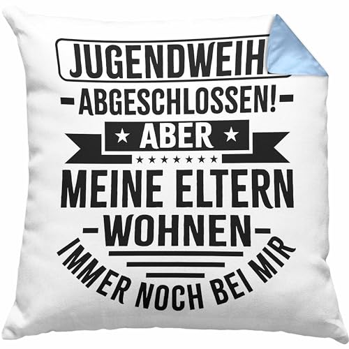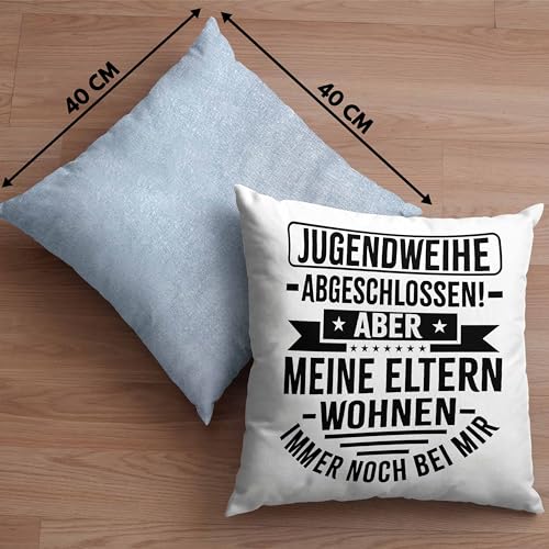 Jugendweihe Abgeschlossen Kissen mit Füllung 40×40 Geschenk Aber Meine Eltern Wohnen Immer Noch Bei Mir Geschenkidee Jugendweihe (Blau)