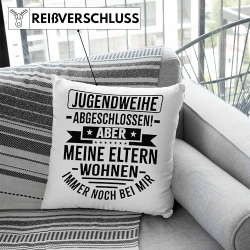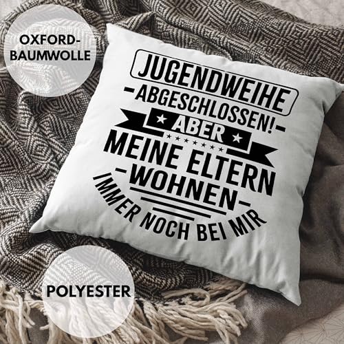 Eine humorvolle Deko-Kissen mit Füllung für Jugendliche, die ihre Jugendweihe separat haben, mit dem Spruch ‚Demgegenüber meine Eltern wohnen immer noch bei mir‘. Eine witzige Geschenkidee, die diesen wichtigen Lebensabschnitt mit Humor feiert