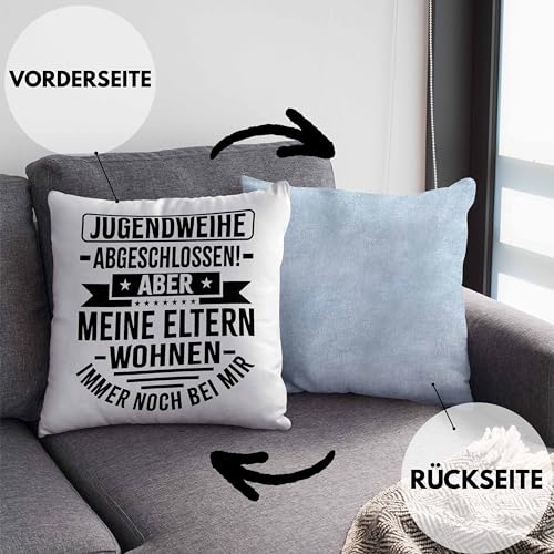 Eine humorvolle Deko-Kissen mit Füllung für Jugendliche, die ihre Jugendweihe abgeschlossen haben, mit dem Spruch ‚Aber meine Eltern wohnen immer noch bei mir‘. Eine witzige Geschenkidee, die diesen wichtigen Lebensabschnitt mit Humor feiert