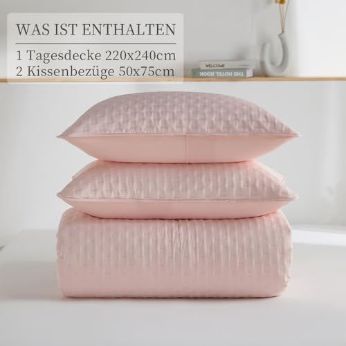 JUNCAI Tagesdecke, Rosa, 220 x 240 cm, weiche, leichte Sommerdecke aus Mikrofaser ohne Bezug für alle Jahreszeiten, 3-teilige Bettüberwurf mit Kissenbezügen (1 Bett überwurfdecke, 2 Kissenbezüge)