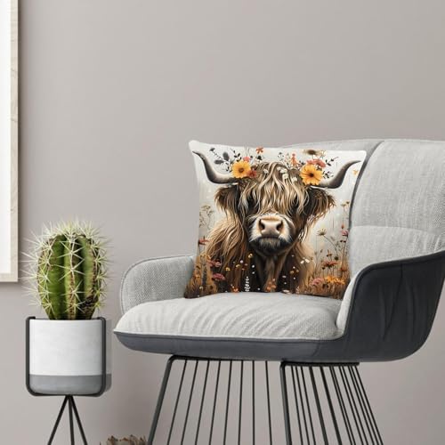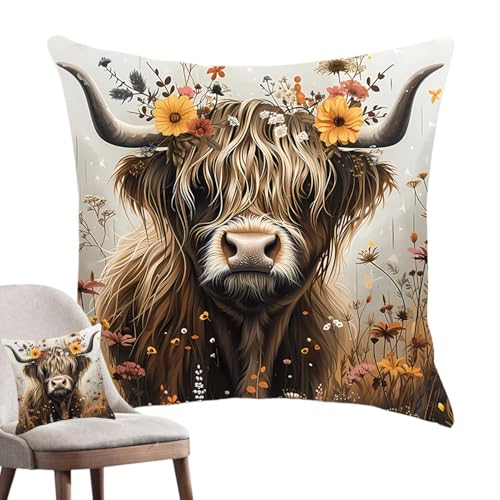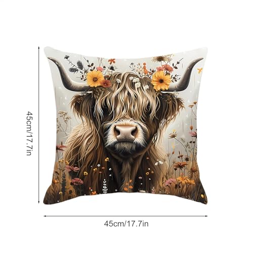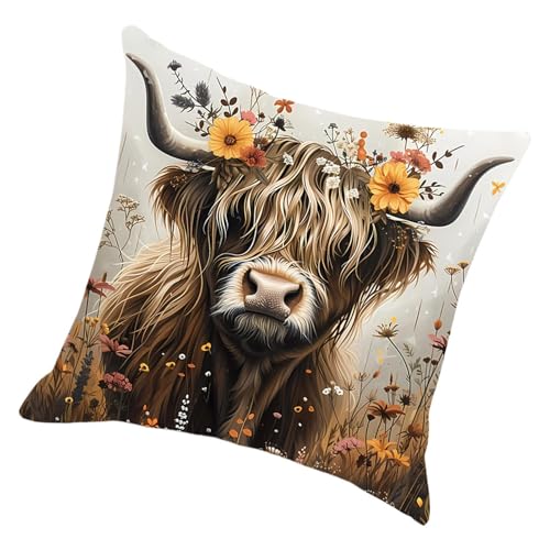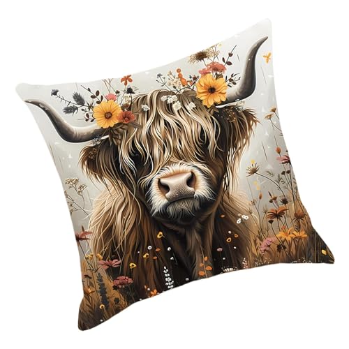 Schönes Design: Mit einem niedlichen Hochlandkuh-Design mit einem Kranz auf dem Kopf und charmanten Blumen im Hintergrund. Dieser Kissenbezug stellt eine warme und natürliche Ambiente in Ihrem Sphäre dar