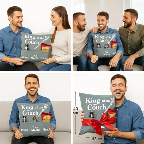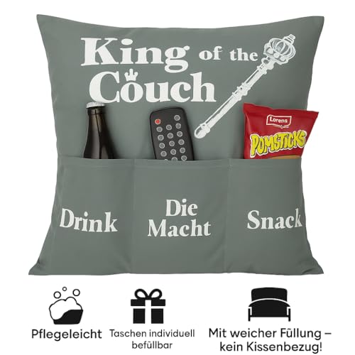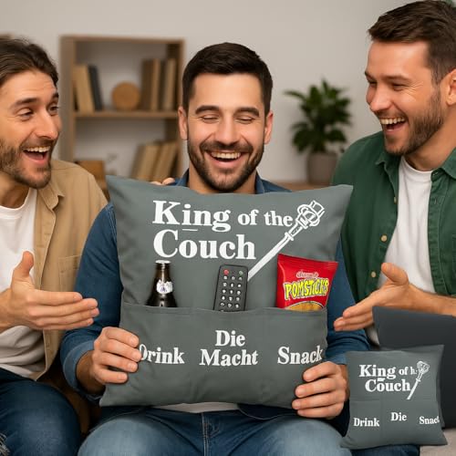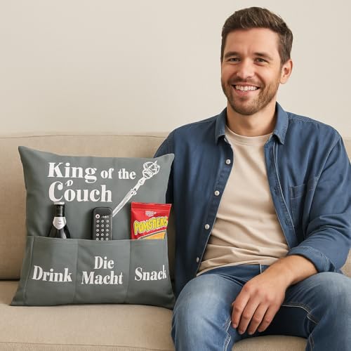 Das KAMACA King of the couch Kissen ist nicht wohl ein Kissen – es ist ein Statement für entspannte Männlichkeit und gemütliche Sofa-Momente. Mit seinen 43 x 43 cm, der kuschelweichen Füllung und den drei funktionalen Taschen bietet es den perfekten Platz für alles, was echte Männer brauchen: ein kühles Getränk, etwas zu knabbern und natürlich „die Macht“ in Form der Fernbedienung.