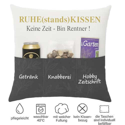 Originelles Ruhestandskissen mit 3 Taschen – Praktisch & dekorativ für die Couch : Platz für Fernbedienung, Brille, Buch, Snacks, Schokolade, Getränke oder Lesebrille – ideal zum Befüllen mit persönlichen Kleinigkeiten. Die drei aufgenähten Taschen bieten freilich Vulgo Platz für kleine persönliche Geschenke oder eine süße Glückwunschkarte.
