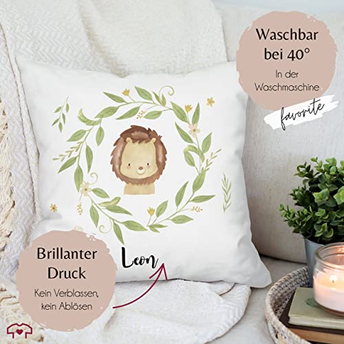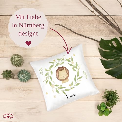 Kissen 40×40 Zierkissen – Löwen – Süßer Löwe im Blumenkranz und Name – 40 x 40 cm – Weiß – löwenmotiv Kinder Tiere Tier Lion Leo Lions Loewen löwe. personalisierte wunschtext personalisiertes
