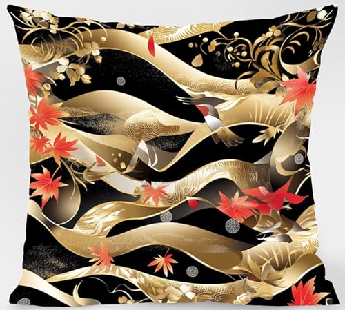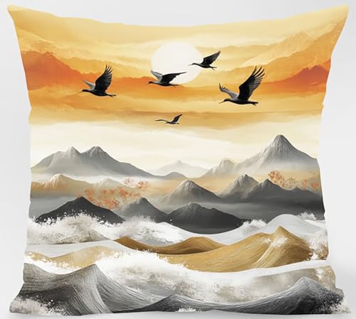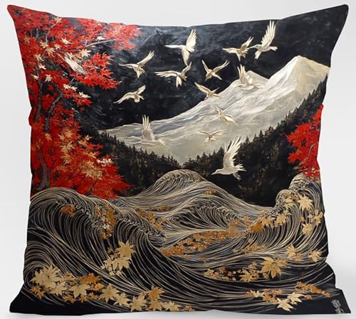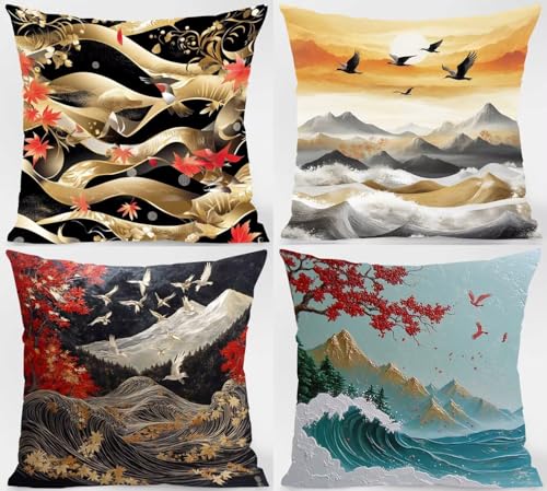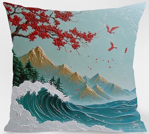 Kissenbezug 35×35 cm 4er Set, Outdoor Kissen Kran Sofakissen Meereswellen Dekokissen, Doppelseitiger Druck Wasserdichtes SanftKissenbezüGe, KissenhüLlen für Schlafzimmer Deko Wohnzimmer Model-12063