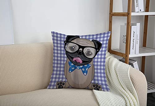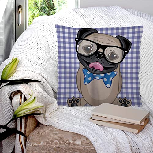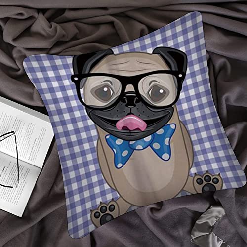 Kissenbezug 45×45 cm,Nerdy-Brille und gepunktete Fliege auf einem Welpen-Mops mit einem kar,Outdoor Kissen Kissenbezüge Kissenhülle Sofa Kissen dekokissen Zierkissen für Wohnzimmer Garten deko draußen