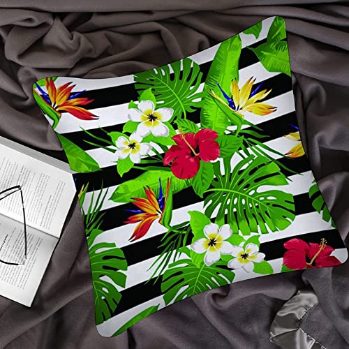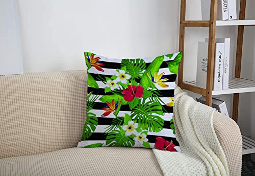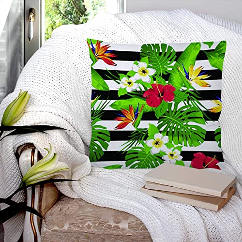 Kissenbezug 45×45 cm,Tropische Blumen und Blätter auf gestreiftem Hintergrund,Outdoor Kissen Kissenbezüge Kissenhülle Sofa Kissen dekokissen Zierkissen für Wohnzimmer Garten deko draußen