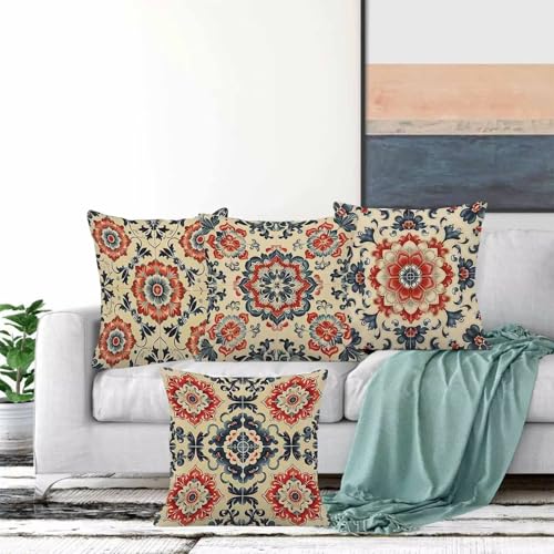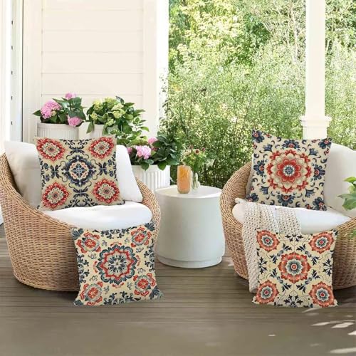 Kissenbezug Mandala Outdoor Kissen 4er Set, Wasserdichter Sofakissen Rot Kissenbezüge Leinen Dekokissen mit Unsichtbarem Reißverschluss Zierkissen für Wohnzimmer Garten Dekorative 65×65 cm-lsy2504PK