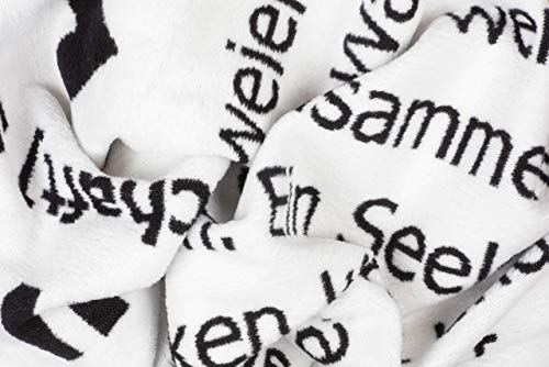 Die Vorderseite der Sprüchedecke über Freundschaft ist weiß und die Schrift schwarz, die Abseite diffizil umgekehrt gestaltet. Das ist ein Qualitätsmerkmal, denn unsere Kolter werden Faden für Faden in einer deutschen Weberei gewebt. So können sich die Worte nicht auswaschen, und die Freude am Geschenk bleibt ein Leben lang.