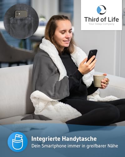 Kuscheldecke 150×200 KAMI flauschig dunkelgrau, Sherpa Tages-Decke für Wohnzimmer, Couch, Sofa, Bett, Sofadecke 150 x 200 mit Handytasche & Hygieneschutz, Große, Dicke, warme Wohndecke für den Winter