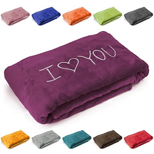 Kuscheldecke ‚I Love You‘, Geschenk zu Valentinstag, Geburtstag, Hochzeitstag, hochwertig Bestickt, 200cm x 150cm extra weiche und gemütliche Sofadecke/Wohndecke, hochwertiges Fleece (Beere)