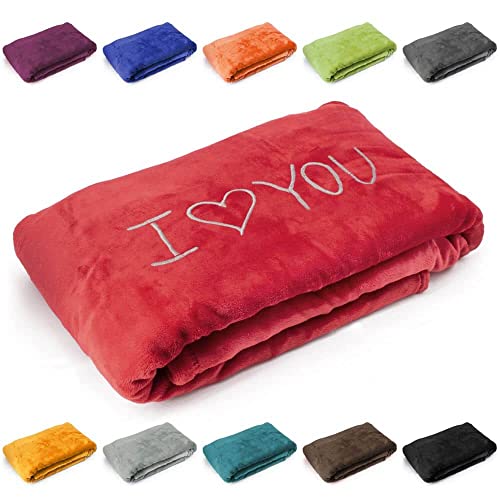 Kuscheldecke ‚I Love You‘, Geschenk zu Valentinstag, Geburtstag, Hochzeitstag, hochwertig Bestickt, 200cm x 150cm extra weiche und gemütliche Sofadecke/Wohndecke, hochwertiges Fleece (Feuerrot)