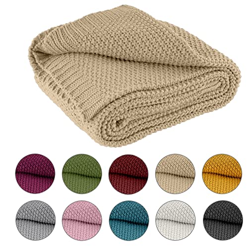 wometo Kuscheldecke Strick 140×190 beige – Strickdecke oekoTex warme weiche Decke mit edlem und schlichten Strickmuster