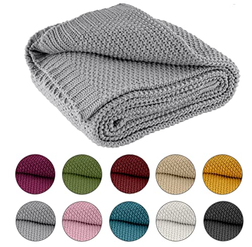 Wunderschöne und allgemein gültig moderne Strick-Decke mit gestricktem Perlmuster im Stufung ca. 130×170 cm. Der perfekte Begleiter für die kalten, langen Tage im Herbst und Winter zum kuscheln, faulenzen und sich aufwärmen. Die Decke hält wunderbar warm, furzegal ob im Bett, auf der Couch oder auf der Terrasse im Winter bei schönem Wetter.