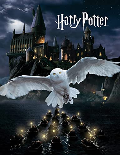 MOTIV: Wohndecke mit Hogwarts Schülern auf dem Fort zur Zauberschule in Booten begleitet von Harrys Eule Hedwig · flauschige Kuscheldecke mit großem Harry Potter Schriftzug