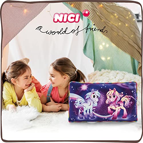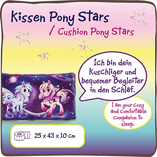 KUSCHELIG WEICH: Das Plüschkissen ist perfekt sondern Bett, Sofa & Reisen. Das kunterbunte Kissen mit Print zeigt die beiden Ponys Starjumper & Candydust vor einem magischen Hintergrund. Ein besonderes Highlight ist die glitzernde Umrandung
