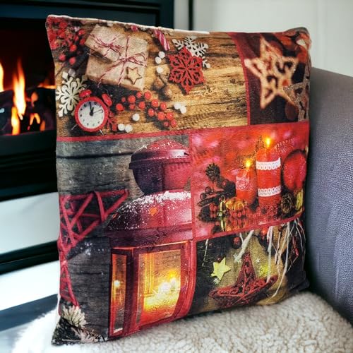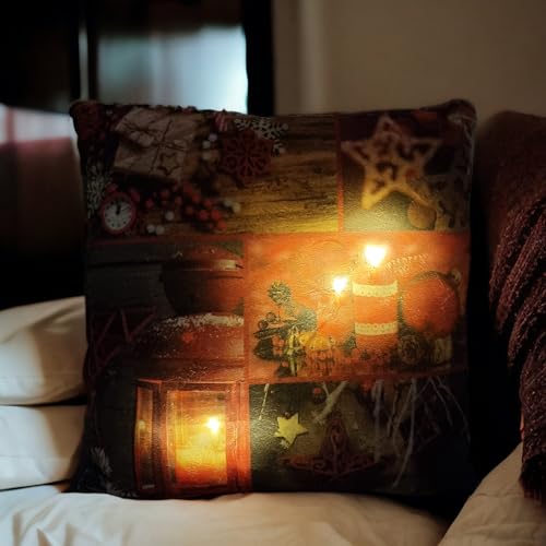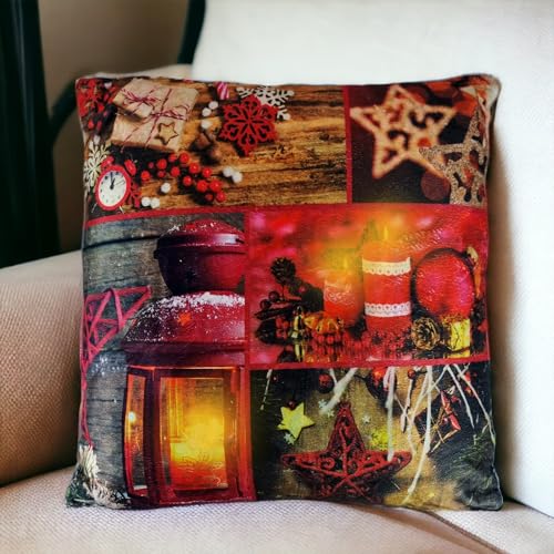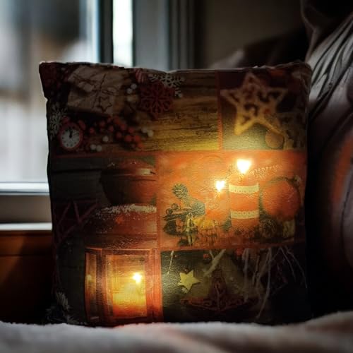 Sicherer Kerzenschein-Effekt ohne Flamme: Das Kissen verfügt über wünderschöne Weihnachts-Motiv mit 3 warmweißen LEDs im Bezug. Diese sehen nach ein sicheres Licht, das an Kerzenschein erinnert, ohne offene Flamme.