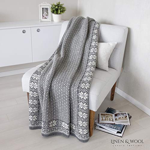 Linen & Cotton Decke Wolldecke Gestrickt North mit Nordisch Muster – 100% Reine Neuseeland Wolle, Grau (130 x 180cm) Wohndecke Kuscheldecke Strick/Sofadecke/Strickdecke/Überwurf/Plaid Couch Sofa