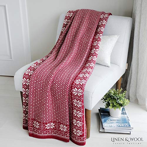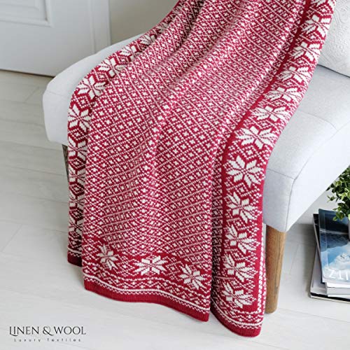 Linen & Cotton Decke Wolldecke Gestrickt North Nordisch Muster -100% Reine Neuseeland Wolle, Bordeaux Rot (130 x 180cm) Wohndecke Kuscheldecke Strick Sofadecke Strickdecke Überwurf Plaid Couch Sofa