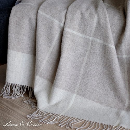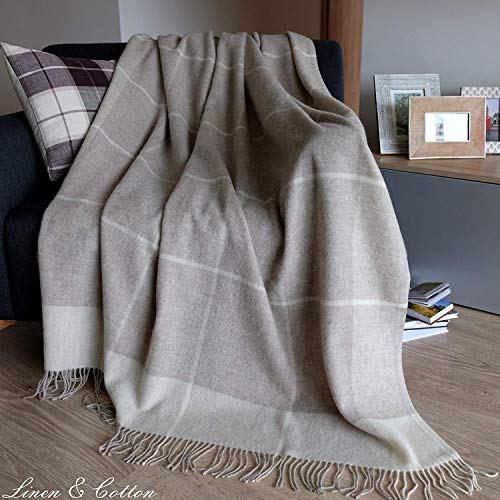 Linen & Cotton Decke Wolldecke Merino Wohndecke Kuscheldecke Kariert Olivia- 100% Weicher Merinowolle, Beige/Braun/Natur (140 x 200 cm) Sofadecke Tagesdecke Schurwolldecke Plaid Blanket Wolle