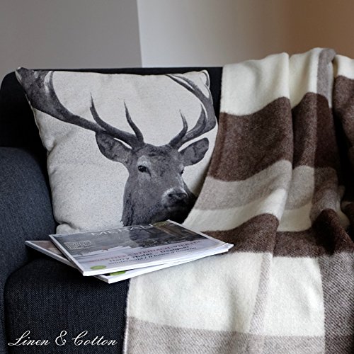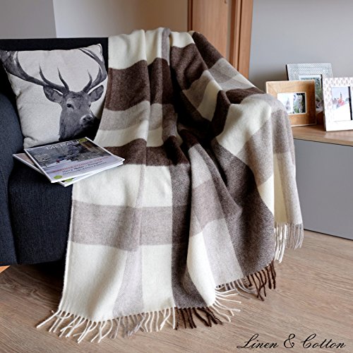 Linen & Cotton Flauschige, Anschmiegsame und Warme Decke Wolldecke Kariert Wohndecke Kuscheldecke Devon – 100% Reine Neuseeland Wolle, Braun/Beige/Natur/Weiß (140 x 200 cm), Sofadecke/Tagesdecke