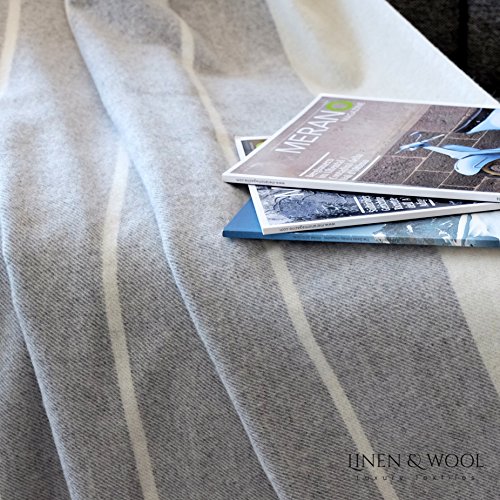Linen & Cotton Decke Wolldecke Merino Wohndecke Kuscheldecke Gestreift Anna – 100% Weicher Merinowolle, Grau/Creme (140 x 200cm), Sofadecke/Tagesdecke/Überwurf/Blanket Schurwolle