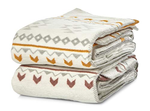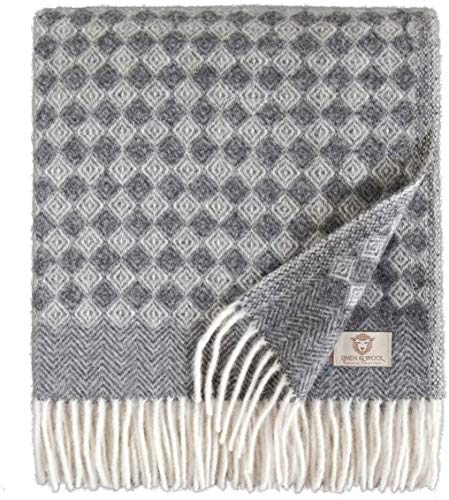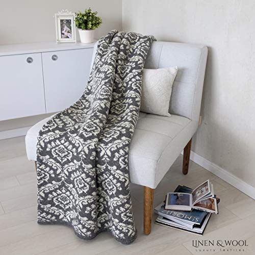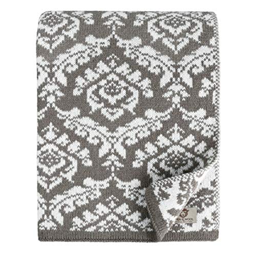 Linen & Cotton Jacquard Decke Wolldecke Gestrickt Caressa Damast Muster – 100% Reine Neuseeland Wolle, Grau/Weiß (135 x 180cm) Wohndecke Kuscheldecke Strick Sofadecke Strickdecke Plaid Couch Sofa